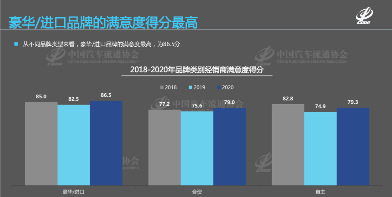 “疫行情”下经销商满意度提升 尽管2020年上半年出现了上千家经销商的退网潮,但从全年情况看,经销商满意度创下近三年来最高值。这是中国汽车流通协会《2020汽车经销商生存状况调查报告》(以下简称《报告》)反映出的情况。 2月初,汽车流通协会月度分析会上发布了上述《报告》。《报告》显示:“2020年经销商总体满意度得分为80.6分,明显好于2018年的79.3分和2018年的77.1分。从不同品牌类型看,2020年豪华/进口品牌、普通洋品牌和中国品牌经销商满意度得分均高于2019年水平。其中豪华/进口品牌的满意度最高,为86.5分。”